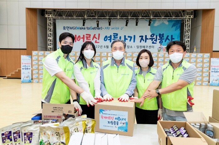 ▲ 독거어르신을 위한 여름나기 키트를 제작하고 박차훈 새마을금고중앙회장(왼쪽에서 세 번째)과 직원들이 기념촬영을 했다. [사진=새마을금고중앙회 제공] |