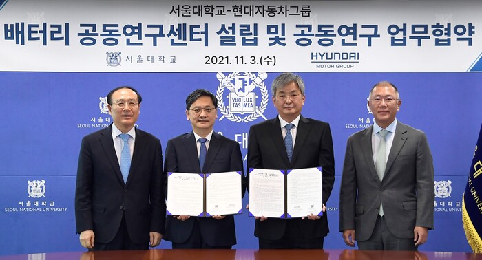 현대차그룹은 서울대학교와 3일 서울 관악구 서울대 관악캠퍼스 행정관에서 ‘현대차그룹‧서울대 배터리 공동연구센터’ 설립과 중장기 공동연구를 위한 업무협약(MOU)을 체결했다고 밝혔다.