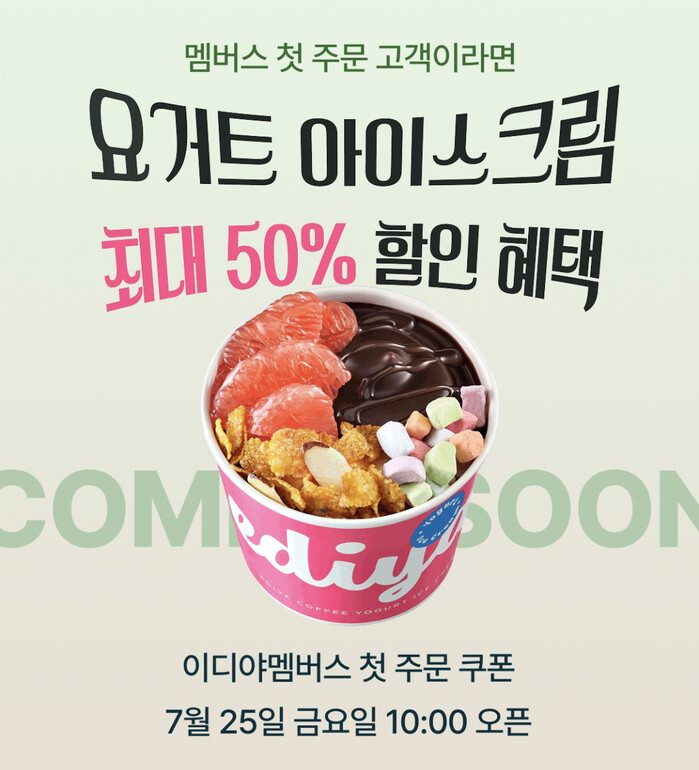 이번 이벤트는 '이디야멤버스' 앱에 신규 가입했거나 아직 배달 또는 픽업 주문 이력이 없는 고객을 대상으로 진행된다. 대상 고객 중 선착순 3만 명에게는 신메뉴 '요거트 아이스크림' 추천 세트 3종(달콤 초코, 든든 베리 망고, 상큼 자몽) 중 1종에 사용할 수 있는 4100원 할인 쿠폰이 제공된다.