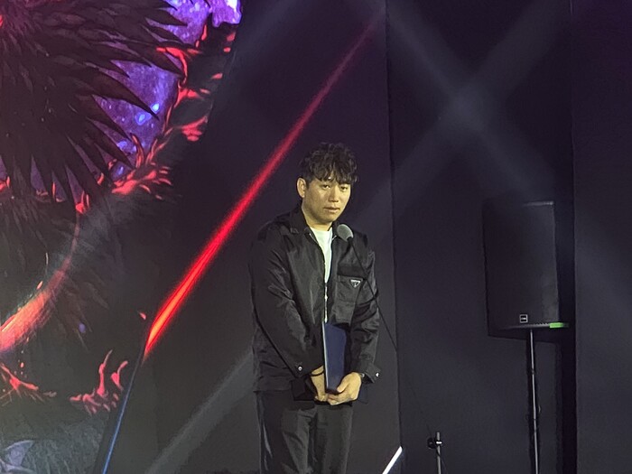 | ▲운명진 네오플 대표가 12일 부산 벡스코에서 열린 대한민국 게임대상 2025 행사를 통해 최우수상 수상 소감을 전하고 있다. [사진=메가경제] |