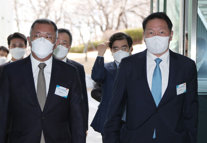 | ▲ 정의선 현대차그룹 회장(왼쪽)과 최태원 SK그룹 회장(오른쪽)이 2일 SK인천석유화학에서 열린 제3차 수소경제위원회에 참석하고 있다. [사진=연합뉴스] |
