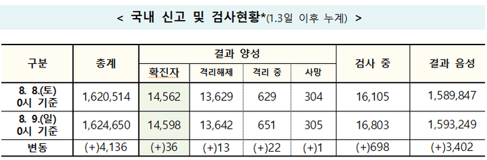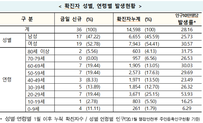 중앙방역대책본부(방대본)는 9일 0시 기준으로 전날 대비 코로나19 일일 전체 확진자가 36명 추가돼 지금까지 누적 확진자는 1만4598명으로 집계됐다고 밝혔다.