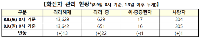 안타깝게도 1명이 더 목숨을 잃으면서 누적 사망자는 305명이 됐다. 치명률은 2.09%였다. 위·중증환자는 16명이다.