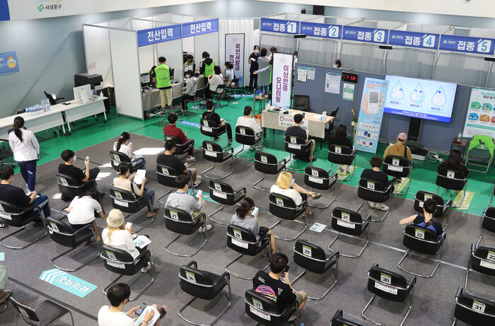 ▲ 15일 오후 서울 서대문구 북아현문화체육센터에 마련된 코로나19 예방접종센터에서 시민들이 백신 접종을 마친 뒤 이상반응 모니터링을 하고 있다. [사진=연합뉴스] |