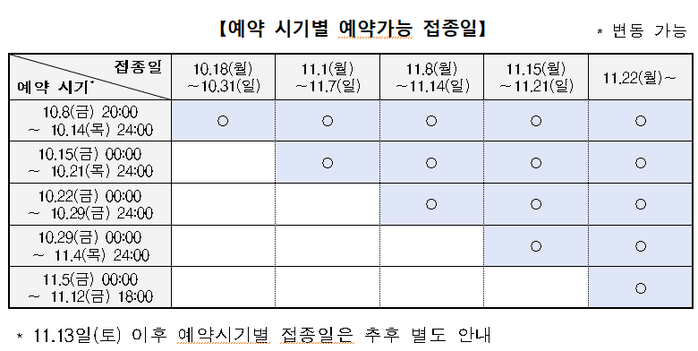 ▲ 임신부 예약 시기별 예약가능 접종일. [코로나19 예방접종대응추진단 제공] |