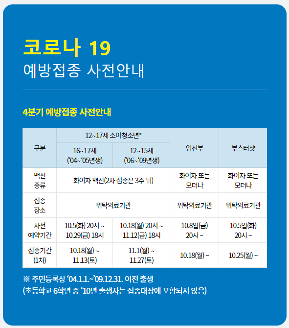 16~17세 대상 예약은 이달 29일 금요일 오후 6시까지 약 4주 간 실시될 예정이며, 이달 18일 월요일부터 내달 13일 토요일까지 전국 위탁의료기관에서 화이자 백신으로 접종받을 수 있다.