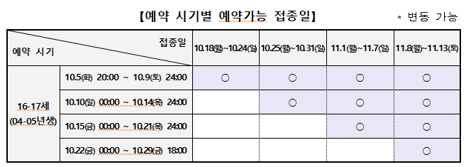 ▲ 16~17세 소아청소년 예약 시기별 예약가능 접종일. [코로나19 예방접종대응추진단 제공] |