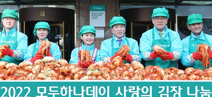 하나금융그룹(회장 함영주)은 11일 하나금융그룹 명동사옥에서 '2022 모두하나데이' 의 시작을 알리는 선포식 과 '사랑의 김장나눔' 행사를 진행했다고 밝혔다.