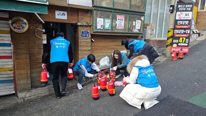 이날 우리금융그룹 임직원들은 서울역 쪽방촌 주변의 노후 환경을 정비하고, 화재 예방을 위한 소화기를 점검했다.