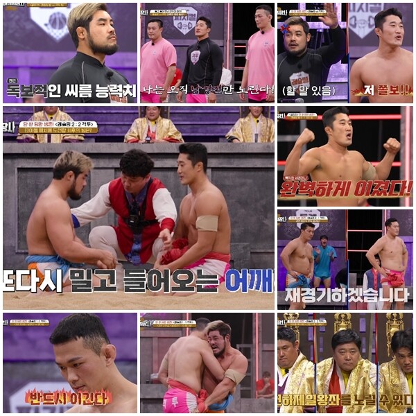 두 선수는 샅바싸움부터 맹수들처럼 저돌적으로 달려들었고, 이에 주심이 중재에 나섰다. 뒤이어 휘슬이 울리자 남경진은 김동현을 모래판에서 뽑아 들었다. 그러나 김동현은 놀라운 균형 감각으로 이를 버텨냈다. 과연 두 선수 중 누가 승리를 맛봤을지, 그리고 양 팀 중 어느 팀이 ‘타이틀 매치전’에 진출해 야구팀과 ‘타이틀 매치전’을 벌일지는 다음 주에 공개된다.