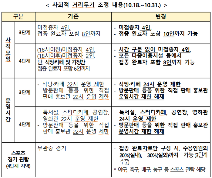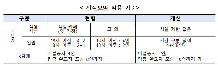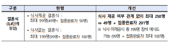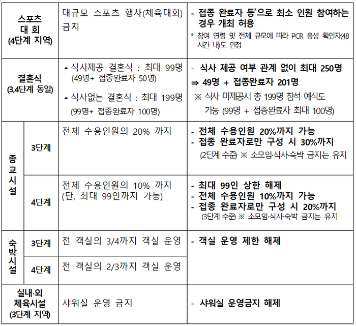 3~4단계에서 식사 제공 여부에 관계없이 최대 250명(49명 + 접종 완료자 201명)까지 가능하도록 조정한다.