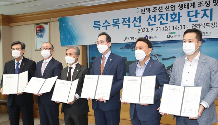 전라북도와 군산시, LIG넥스원, 호원대, 한국조선해양기자재연구원, 군산조선해양기술사업협동조합은 21일 전북도청에서 ‘전북 조선산업 생태계 조성 및 발전을 위한 상호 협력교류’ 업무협약을 체결했다.