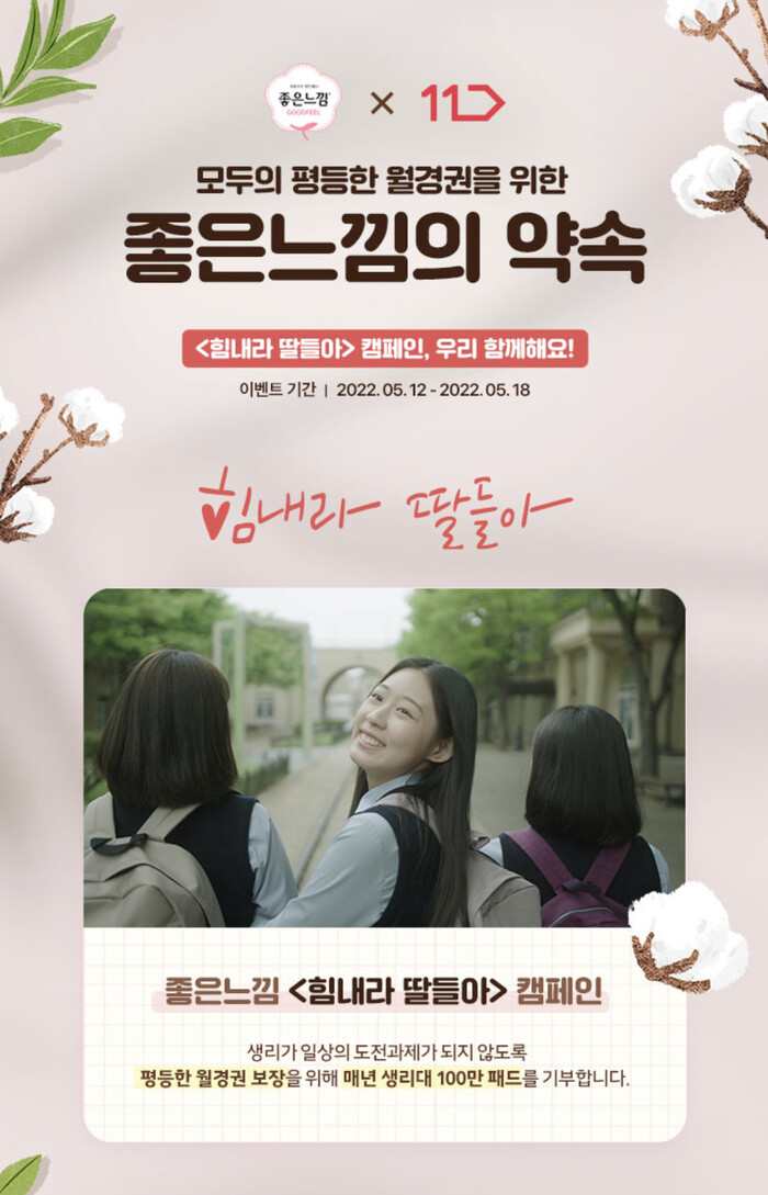 11번가는 지난 2018년부터 매년 유한킴벌리의 여성용품 브랜드 ‘좋은느낌’과 힘내라 딸들아 캠페인을 진행해오며 경제적인 이유 등으로 생리대 구입에 어려움을 겪는 청소년들을 지원해왔다고 설명했다.
