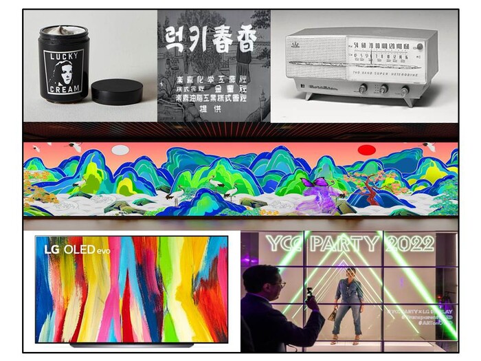 | ▲ LG가 전시하는 (좌측상단부터 시계방향순) 락희화학공업사 '럭키크림'과 락희화학공업사 ‘럭키춘향편’ 광고, 금성사 'A-501' 라디오, LG전자 LED 사이니지, LG디스플레이 투명 OLED, LG전자 올레드 TV [LG 제공] |