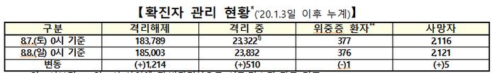 ▲ 8일 0시 기준 코로나19 확진자 관리 현황. [출처=중앙방역대책본부] |