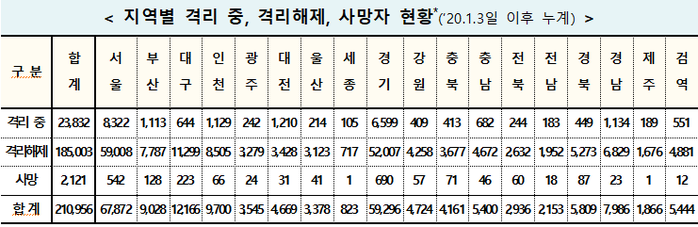 전날 하루 1214명이 추가 완치돼 누적 격리해제자는 18만5003명으로 완치율은 87.70%를 보이고 있다. 격리치료 중인 환자는 510명 늘어 총 2만3832명이다.