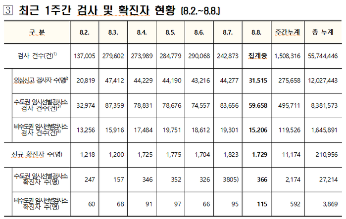 ▲ 최근 1주간 검사 및 확진자 현황. [출처=중앙방역대책본부] |