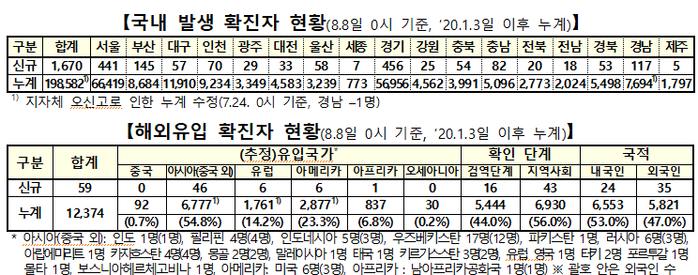 ▲ 8일 0시 기준 코로나19 국내발생(지역발생) 및 해외유입 확진자 현황. [출처=중앙방역대책본부] |