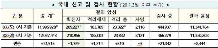 중앙방역대책본부(방대본)는 8일 0시 기준으로 코로나19 신규 확진자가 1729명 발생해 지금까지 누적 확진자는 21만956명으로 21만명을 넘었다. 이중 해외유입 누적 확진자는 1만2374명이다.