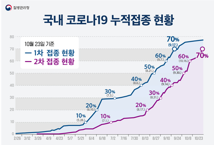 국내 코로나19 백신 접종 완료율이 70% 고지에 도달하면서 단계적 일상회복(위드 코로나)을 위해 한발짝 더 다가섰다.