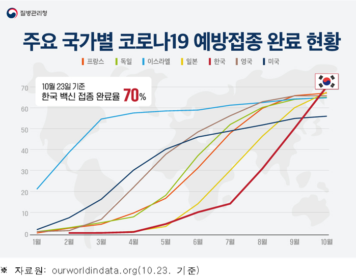 이어 독일(2020년 12월 26일 시작) 65.5%(10월 21일 기준), 일본(2021년 2월 17일 시작) 69.0%(10월 21일 기준), 미국(2020년 12월 14일 시작) 56.5%(10월 21일 기준) 순이다.