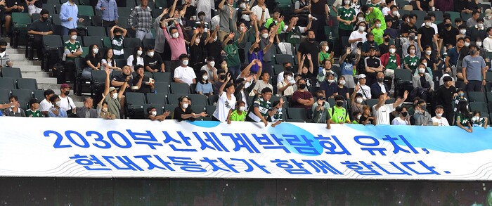 | ▲ 전북 현대 모터스의 홈구장인 전주월드컵 경기장에서 열린 FC서울과의 경기 중 부산세계박람회 유치를 응원하는 대형 플래카드가 설치된 관중석의 모습. [사진=현대자동차그룹 제공] |