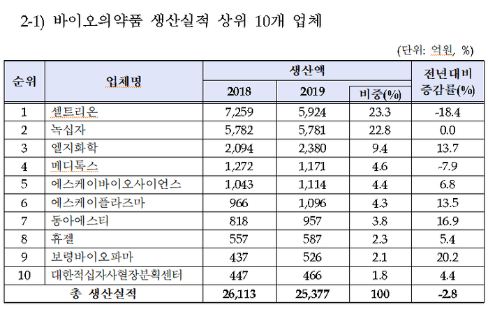 ▲바이오의약품 생산실적 상위 10개 업체. [출처= 식품의약품안전처] |