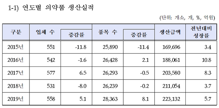지난해 국내 의약품 생산실적은 22조 3132억 원으로 재작년 21조1054억원 대비 시장규모가 5.7% 커졌고, 최근 5년간(15년~19년) 연평균 7.1% 성장해 전체 제조업 성장률(2.4%)의 3배에 도달했다.
