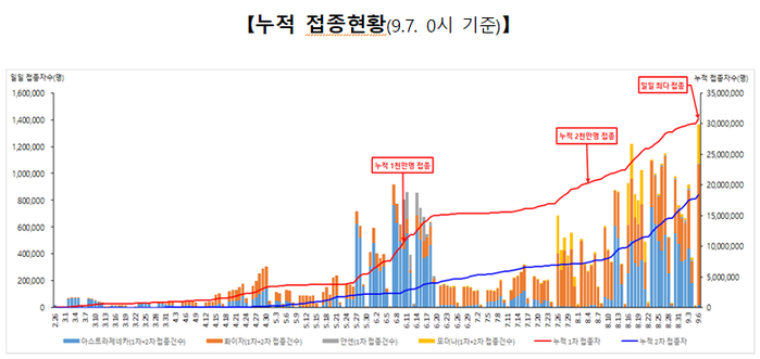 누적 1차 접종자 수는 4월 29일에 300만 명을 넘어섰고, 6월 10일에 1000만 명, 8월 3일에 2000만 명, 9월 5일에 3000만 명을 잇따라 달성하면서 속도를 높이고 있다.