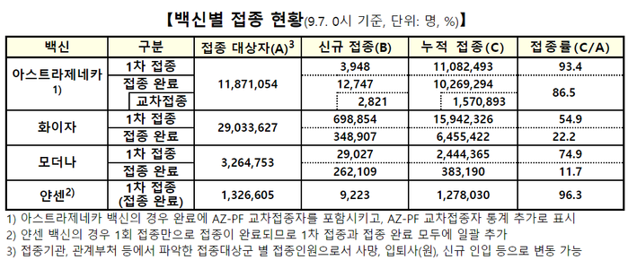 ▲ 7일 0시 기준 백신별 접종 현황. [출처=질병관리청] |
