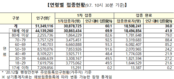 ▲ 7일 오전 10시 30분 기준 연령별 접종 현황. [출처=질병관리청] |