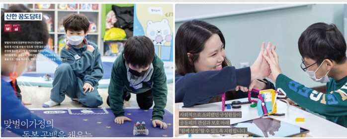 신한금융은 저출산 해소를 위해 특히 앞장서고 있다. 지난 2018년부터 공동육아나눔터인 ‘꿈도담터’를 구축해 맞벌이 가정의 자녀들이 방과 후 시간을 보낼 수 있는 장소를 새롭게 설치하고, 노후화됐거나 재해로 인해 리모델링이 필요한 시설에는 공간 인테리어 개선과 기자재 지원을 통해 부모가 안심할 수 있는 육아 공간을 조성하고 있다.