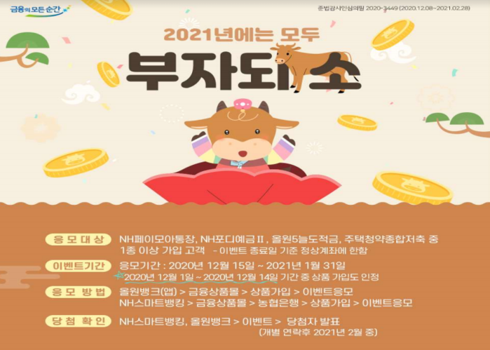 [메가경제=최낙형 기자] NH농협은행은 신축년 새해를 맞이해 오는 31일까지 디지털 금융상품 가입고객을 대상으로 ‘2021년에는 모두 부자되소’ 이벤트를 진행한다고 8일 밝혔다.