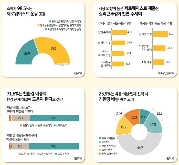 ‘소비자의 친환경 소비 트렌드’ 부분에서 응답자의 60%는 제로웨이스트(Zero-waste, 쓰레기 없애기)에 대해 ‘필요성은 공감하지만, 실천하지 못하고 있다’고 답했다. 제로웨이스트 운동은 재활용과 재사용을 통해 폐기물을 없애는 것은 물론, 폐기물을 토지, 해양, 공기로 배출하지 않으며 책임 있는 생산, 소비, 재사용, 회수를 통해 모든 자원을 보전하는 것을 목표로 하는 운동이다.