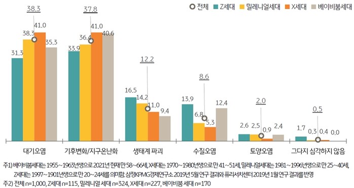 ▲ 응답자의 76%가 ‘대기오염’과 ‘기후변화 및 지구온난화’를 가장 심각한 환경 문제로 생각하고 있다. [자료=KB금융그룹 제공] |