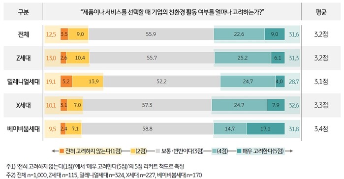 ‘소비자의 친환경 소비 인식’ 부분에서는 일상에서 친환경 행동을 가장 잘 실천할 수 있는 분야로 소비·교통·교육·주거·직장 분야 중 응답자의 50%가 세대별 상관없이 실천이 용이한 ‘소비’ 분야를 꼽았다. 또한, 응답자의 3분의 1은 ‘제품 구매 시 기업의 친환경 활동 여부’를 고려한다고 답했고, 54%는 ‘친환경 제품 구매 시 10% 이내 추가 비용을 낼 의향이 있다’고 답했다.