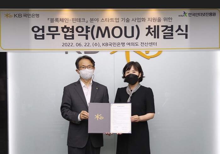 KB국민은행(은행장 이재근)은 지난 22일 한국인터넷진흥원(원장 이원태)과 ‘블록체인ㆍ핀테크 스타트업 기술 사업화 지원 협력을 위한 업무협약’을 체결했다고 밝혔다.