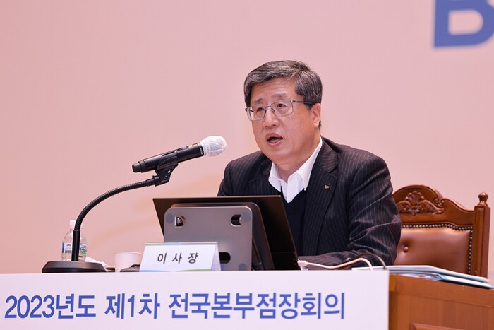 | ▲ 최원목 신용보증기금 이사장이 10일 대구 본점에서 열린 ‘2023년도 제1차 전국본부점장 회의’에서 새롭게 수립된 뉴비전을 발표하고 있다. [사진=신용보증기금 제공] |