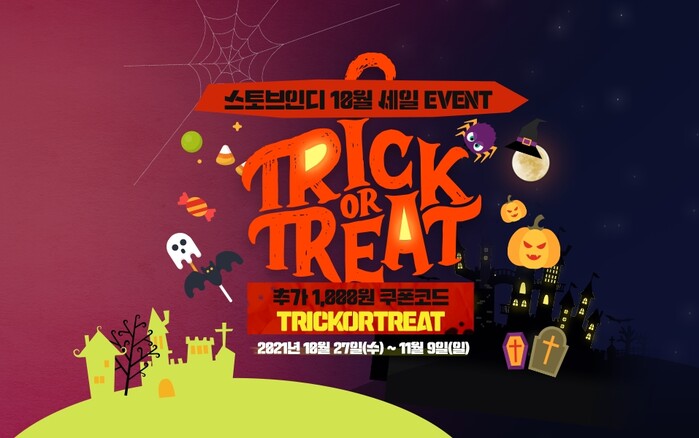 또한 스토브는 할로윈을 맞아 공포 게임과 힐링 게임 특별 할인 이벤트도 실시한다. 이번 할인 대상 게임은 총 24종이다. 할인가에 더해 쿠폰 번호에 ‘TRICKORTREAT’을 입력하면 누구나 사용할 수 있는 1000원 할인 쿠폰이 추가로 지급된다.