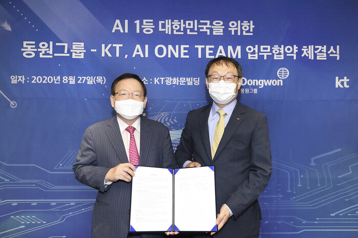 KT는 27일 동원그룹이 ‘대한민국 AI 1등 국가를 위한 업무협약(MOU)’을 맺고 AI 원팀에 합류하기로 했다고 밝혔다.