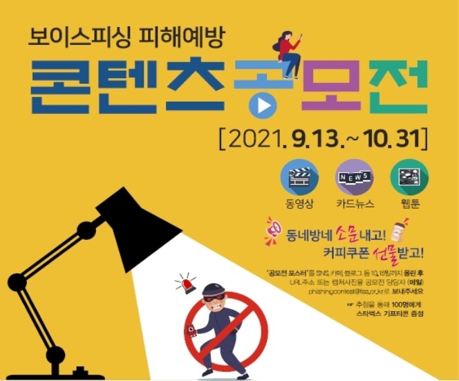 공모 주제는 보이스피싱 피해 예방이며, 공모 분야는 ▲동영상 ▲카드뉴스 ▲웹툰 등 3개 부문이다. 관심 있는 국민은 오는 9월13일부터 10월31일까지 이메일을 통해 참가신청서와 작품을 제출하면 된다.