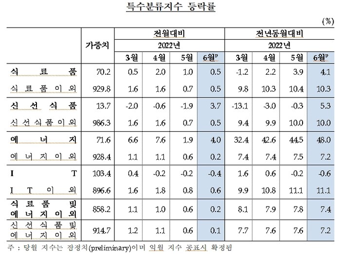 특수분류별로 보면, 전월 대비 식료품은 0.5%, 신선식품은 3.7% 각각 상승했으며, 에너지는 4.0% 올랐으나 IT는 0.4% 내렸다.