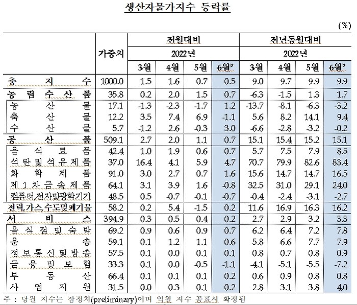 6월 공산품 생산물가도 석탄·석유제품(4.7%)과 화학제품(1.6%) 등이 오르면서 전월 대비 0.7% 상승했다.