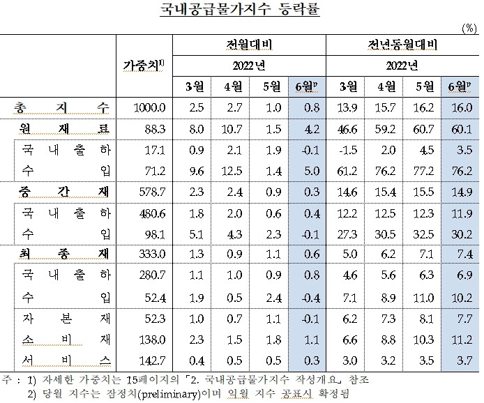 수입품까지 포함해 국내에 공급되는 상품과 서비스의 가격 변동을 측정한 국내공급물가지수는 전월 대비 0.8% 올랐다. 전년 동월 대비로는 16.0% 상승했다.