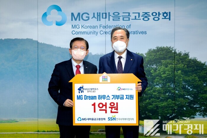 ▲서울 강남구 삼성동 새마을금고중앙회 본부 회관에서 4일 새마을금고중앙회 및 한국사회복지협의회 관계자들이 ‘MG Dream 하우스’ 기부금 전달식을 갖았다. (사진우측부터 박차훈 새마을금고중앙회장, 서상목 한국사회복지협의회장) [사진=새마을금고중앙회 제공] |