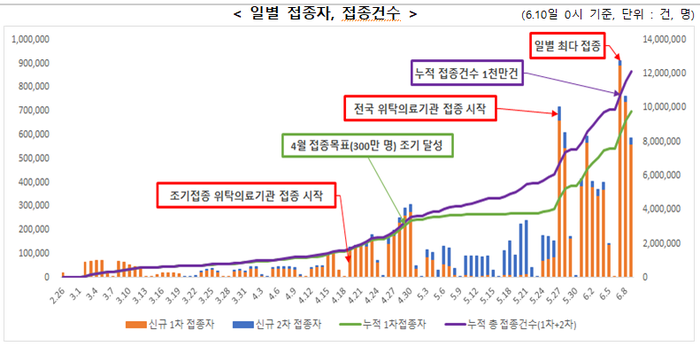 10일 0시 기준으로 접종 시작 후 하루 평균 접종 인원은 약 11만7천명이고, 하루 최다 접종 건수는 91만3천건(6월 7일)이다.