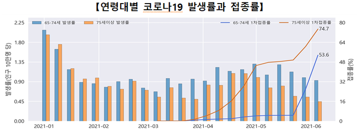 연령별 접종률과 확진자 발생률을 분석해 보면, 접종률이 상대적으로 높은 75세 이상 연령대에서의 코로나19 발생이 뚜렷한 감소세를 보이고 있다.