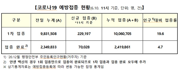 10일 오전 11시 현재, 누적 1·2차 접종을 모두 마친 접종완료자는 총 234만9833명으로 전체 인구의 4.7%를 차지한다.