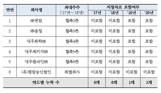 이에 더해 박 회장은 대우화학·대우패키지·대우컴바인 등 3개사 관련 친족 7명에 대해 이미 인지하고 있던 상황에서 공정위 자료 제출 시 누락시킨 사실이 드러났다. 총수의 혈족 6촌, 인척 4촌 이내 친족은 현황자료에 기재하도록 돼 있다. 이를 통해 친족 보유 미편입계열사가 규제기관·시민단체 등 외부감시시스템의 사각지대에서 내부거래를 할 수 있었다는 지적이다.