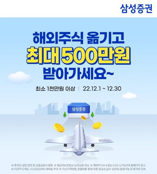 삼성증권은 타사에 보유하고 있는 해외주식을 1000만원 이상 삼성증권에 입고한 뒤, 해당 금액 이상 해외주식을 온라인으로 거래하면 매매 금액에 따라 최대 500만원의 리워드 혜택을 제공하는 이벤트를 12월 30일까지 진행한다고 9일 밝혔다.